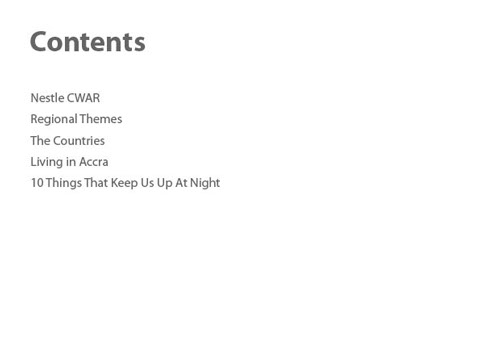 This book was put together for John Thompson, the Marketing Communications Director at Nestle, Ghana (Industry Food & Beverages). It was designed as a guide to help him become adjusted to his new role. This was later used by the agency to help with their strategic planning for the region, which is made up of 22 countries.